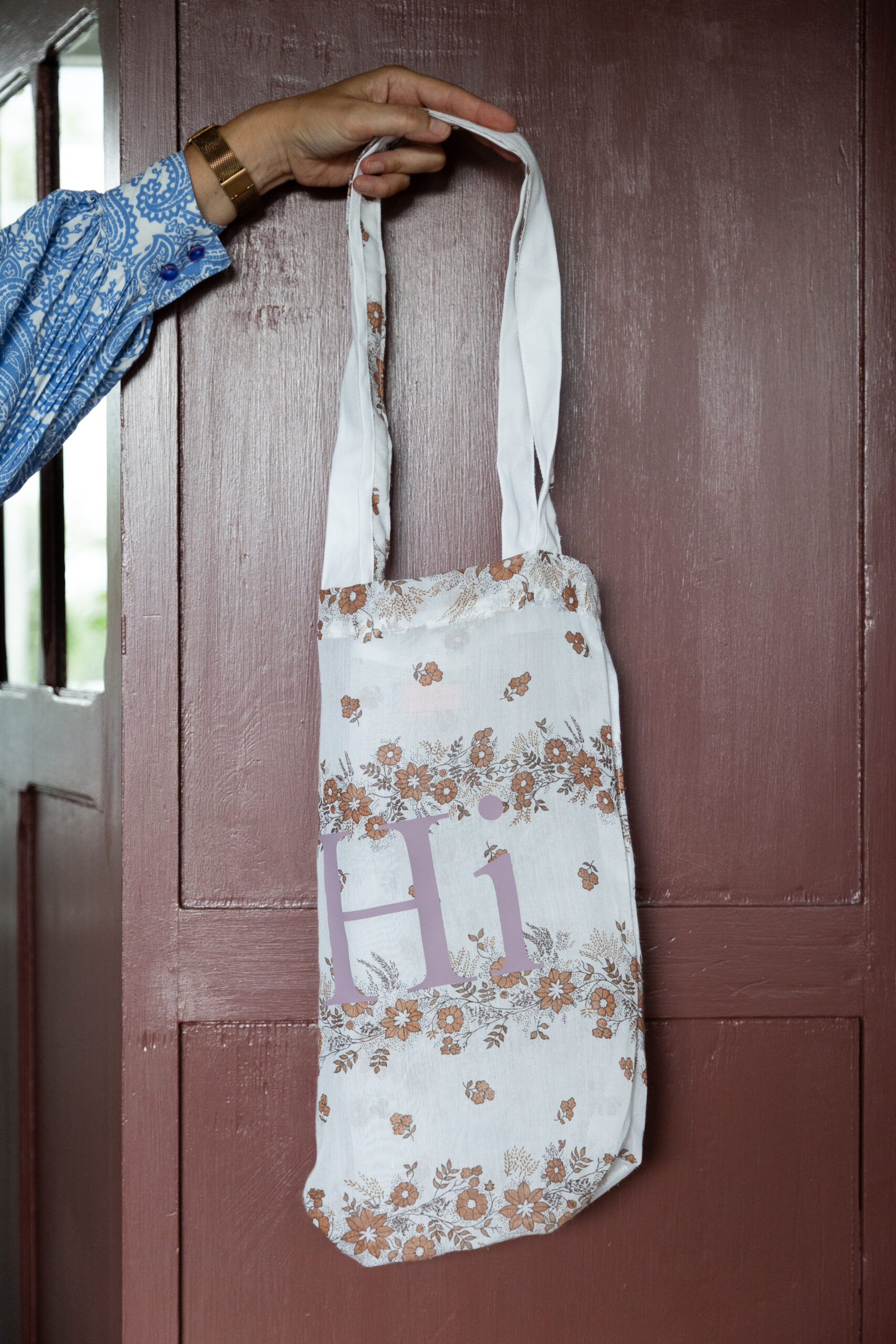 Tas gemaakt van een bruin gebloemde vitrage met opdruk Hi.